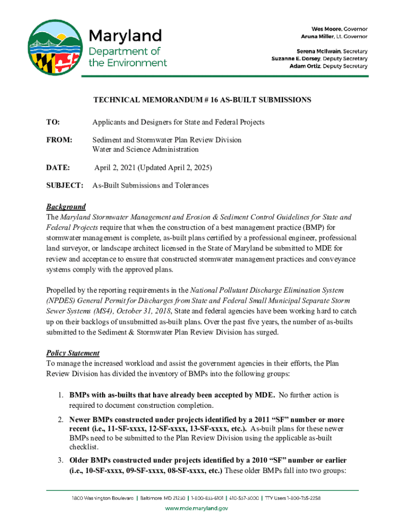 This technical memorandum outlines the requirements and procedures for submitting as-built plans for stormwater management systems in Maryland, detailing the policy and essential elements needed for