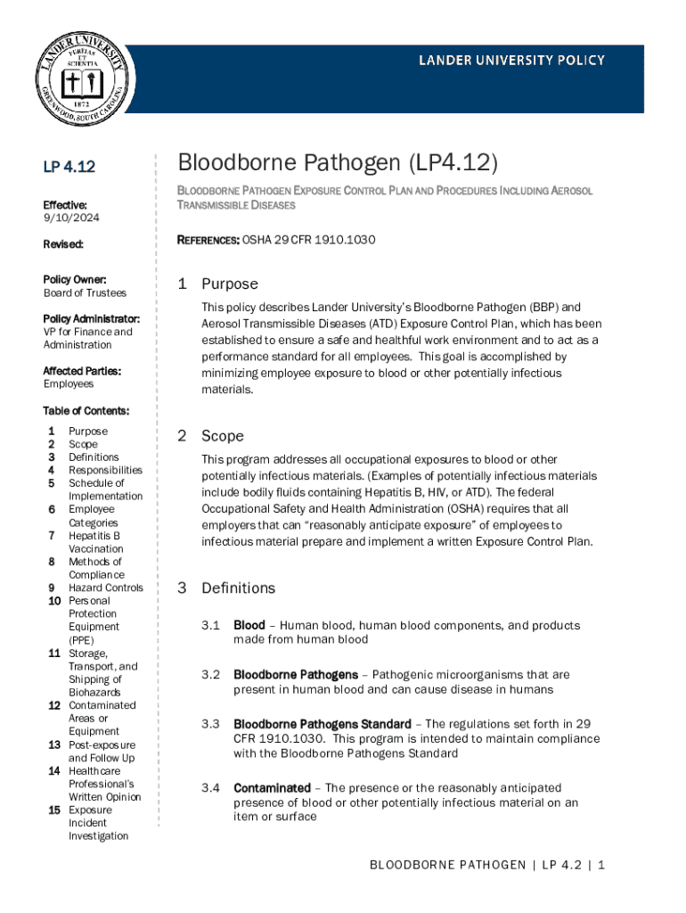 This document outlines Lander University’s Bloodborne Pathogen and Aerosol Transmissible Diseases Exposure Control Plan, detailing policies, procedures, and responsibilities to ensure a safe work