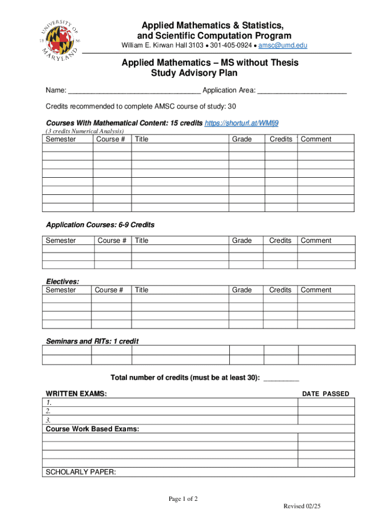 Get the free Applied Mathematics – Ms Without Thesis Study Advisory Plan - amsc umd