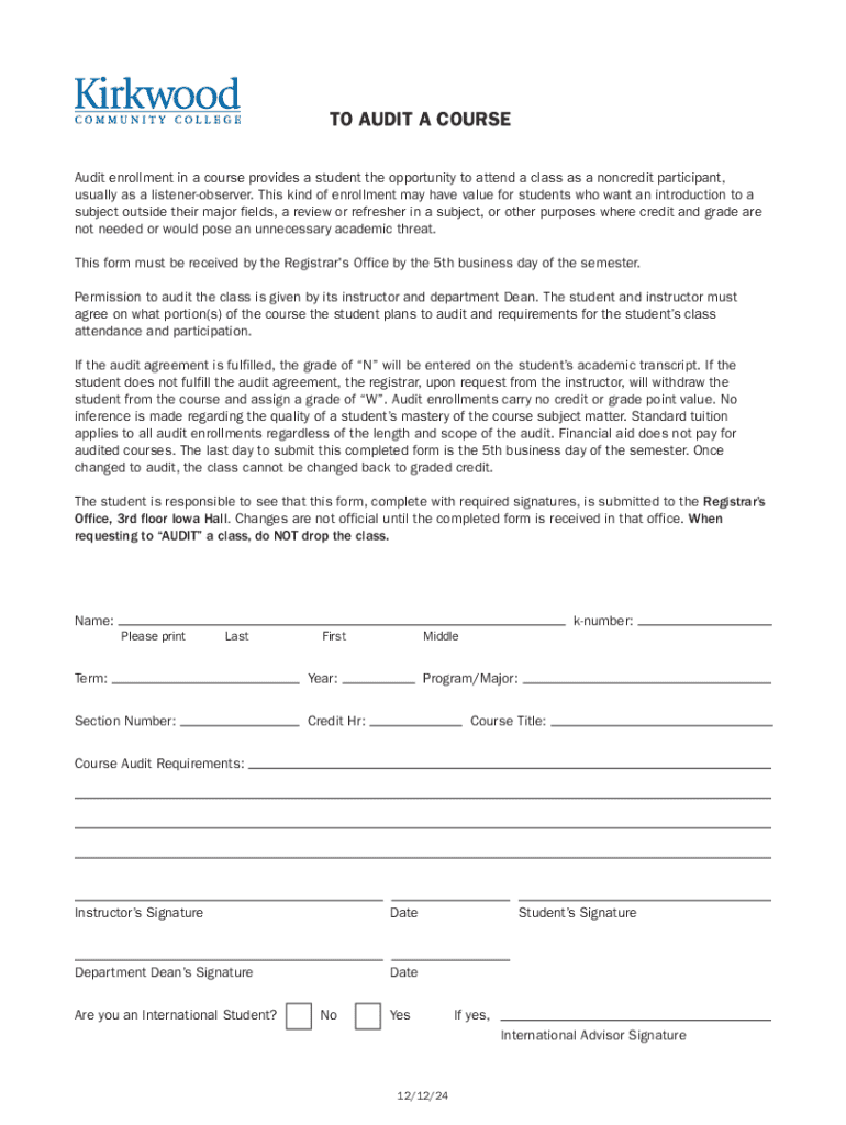 An audit course is an academic option allowing students to attend classes without receiving academic credit. This approach can be particularly beneficial for those looking to explore subjects of interest, enhance their knowledge base, or bolster their resumes without the pressure of performing at a graded level. The audit course form is a crucial document that formalizes the intent to audit a particular course.