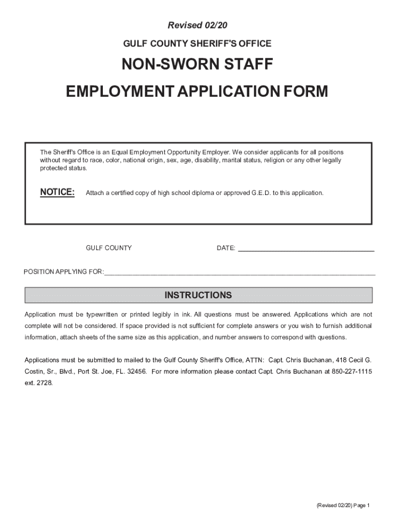 This document serves as an application form for non-sworn staff positions at the Gulf County Sheriff\'s Office, detailing requirements, instructions, and background information necessary for employment
