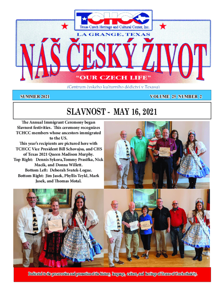 This document serves as a newsletter for the Texas Czech Heritage and Cultural Center, detailing events, missions, and community recognitions related to the heritage, language, and culture of Texans