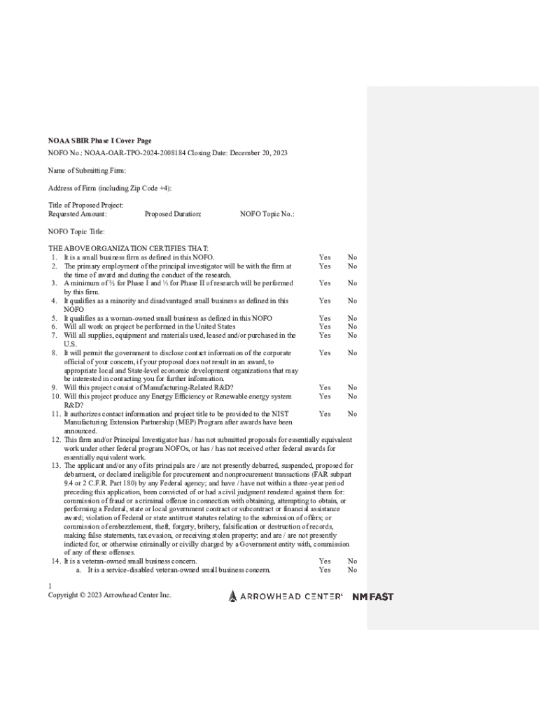 Get the free Noaa Sbir Phase I Cover Page - arrowheadcenter nmsu
