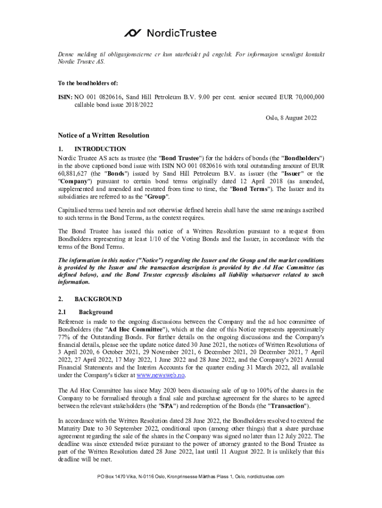 Meldingen til obligasjonseierne vedrørende forlengelse av forfall og andre beslutninger relatert til obligasjonsutstedelsen av Sand Hill Petroleum B.V.
