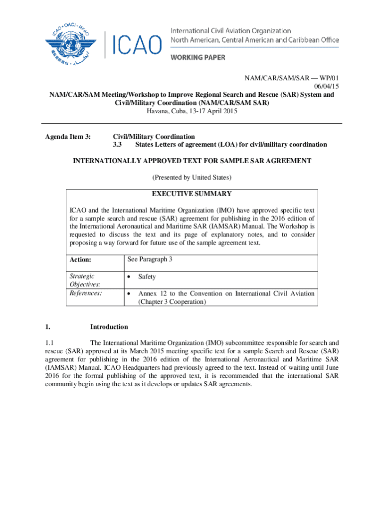 This document outlines the agenda and discussions regarding the improvement of the search and rescue (SAR) system, specifically focusing on civil/military coordination and the proposal of a sample