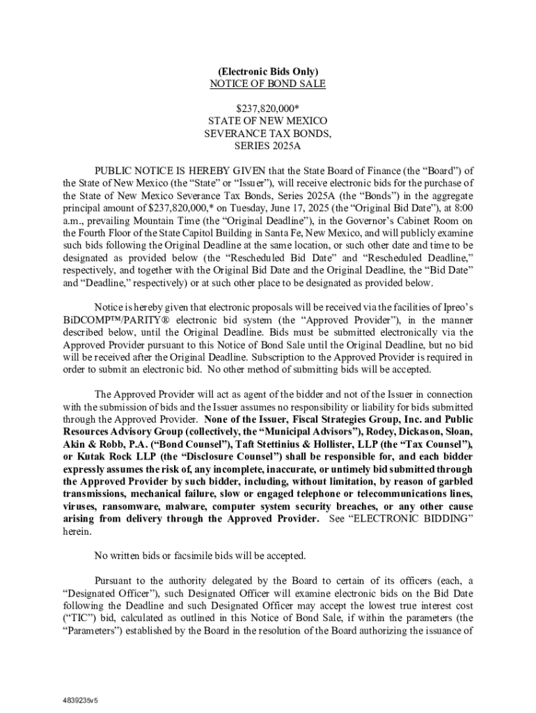 This document provides public notice regarding the sale of $237,820,000 Severance Tax Bonds by the State of New Mexico, detailing the bidding process, bond terms, interest rates, and other related