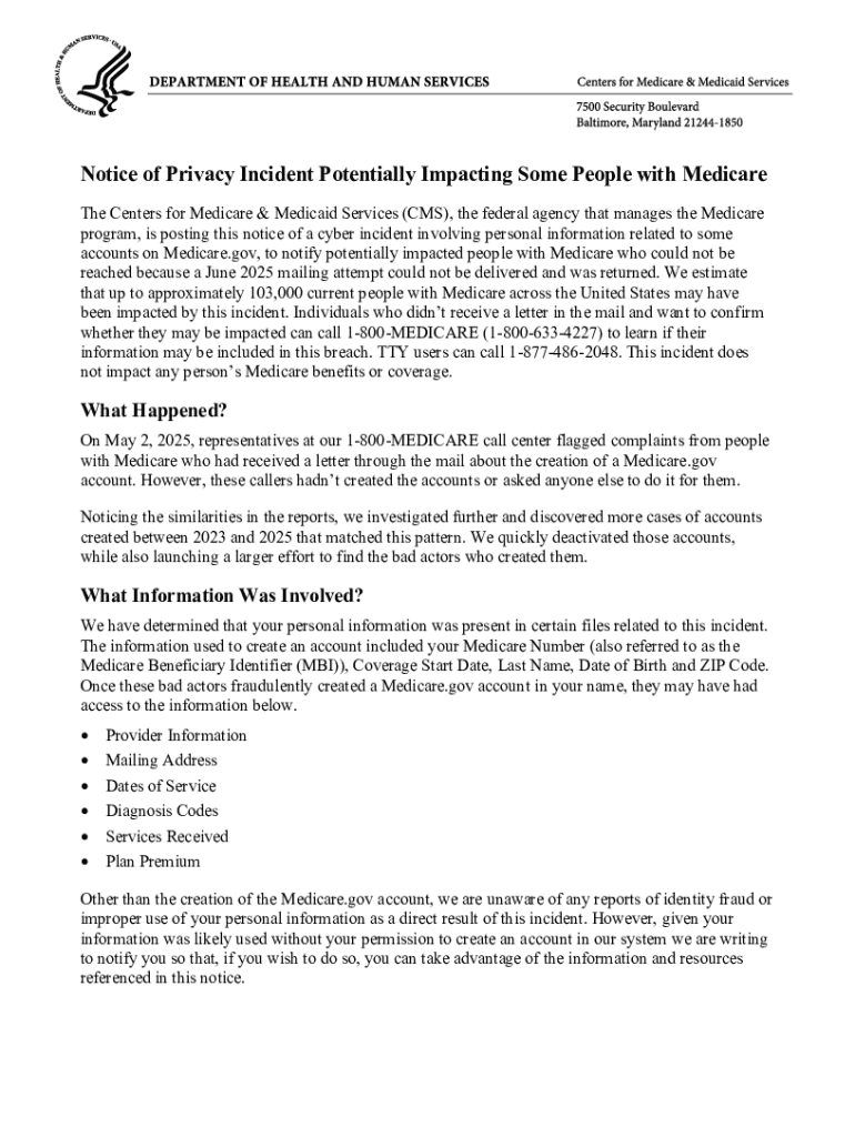 Get the free Notice of Privacy Incident Potentially Impacting Some People With Medicare