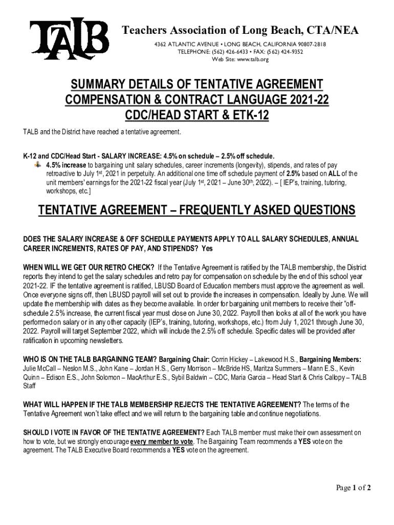 Get the free Talb Tentative Agreement