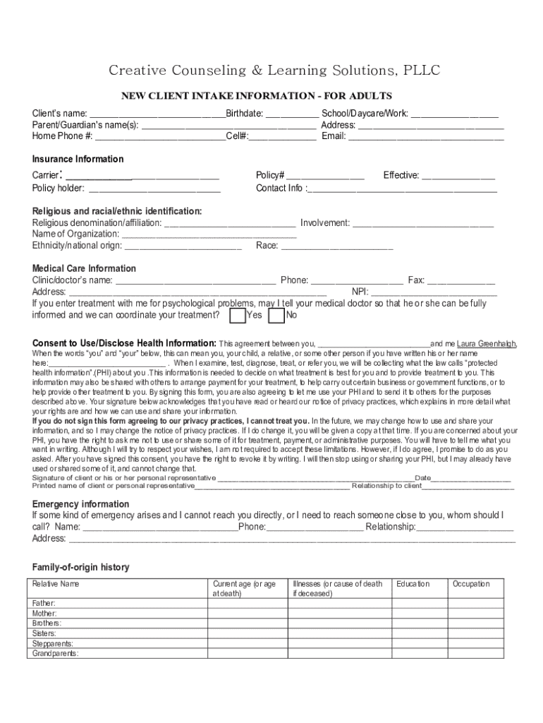Get the free New Client Intake Information - for Adults