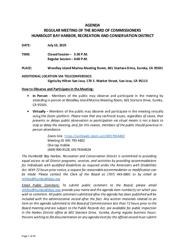 This document outlines the agenda for the regular meeting of the Humboldt Bay Harbor, Recreation and Conservation District Board of Commissioners, including details on meeting times, locations, and