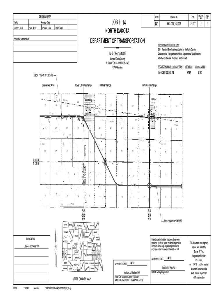 Details regarding traffic data, project specifications, and construction sign layouts for highway maintenance and repair in North Dakota.