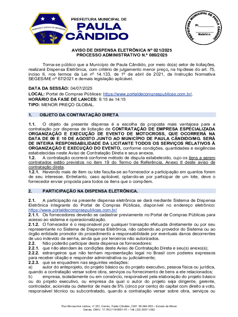 O documento trata da realização de uma Dispensa Eletrônica para a contratação de empresa especializada na organização e execução de evento de motocross, que ocorrerá nos dias 09 e 10 de