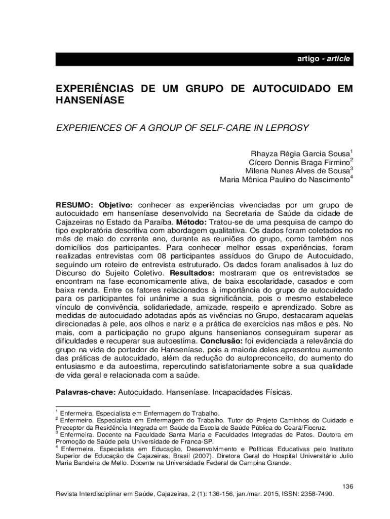 Obtenha o gratuito Experiências De Um Grupo De Autocuidado Em Hanseníase