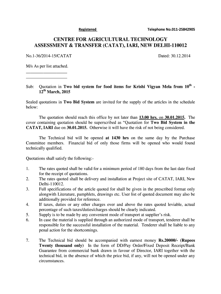 Registered Telephone No.01125842905 Center FOR AGRICULTURAL TECHNOLOGY ASSESSMENT & TRANSFER (CARAT), MARI, NEW DELHI110012 No.136/201415/CATAT Dated: 30.12.2014 M/s As per list attached. Sub: Quotation
