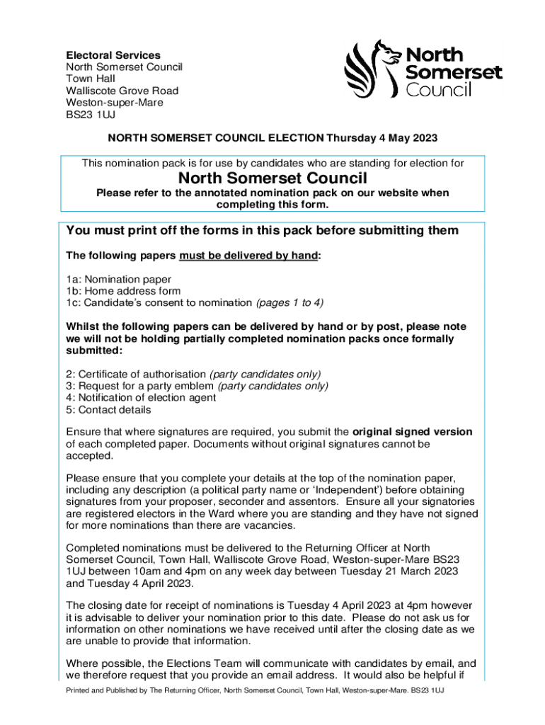 Get the free North Somerset Council Election Nomination Pack - n-somerset gov