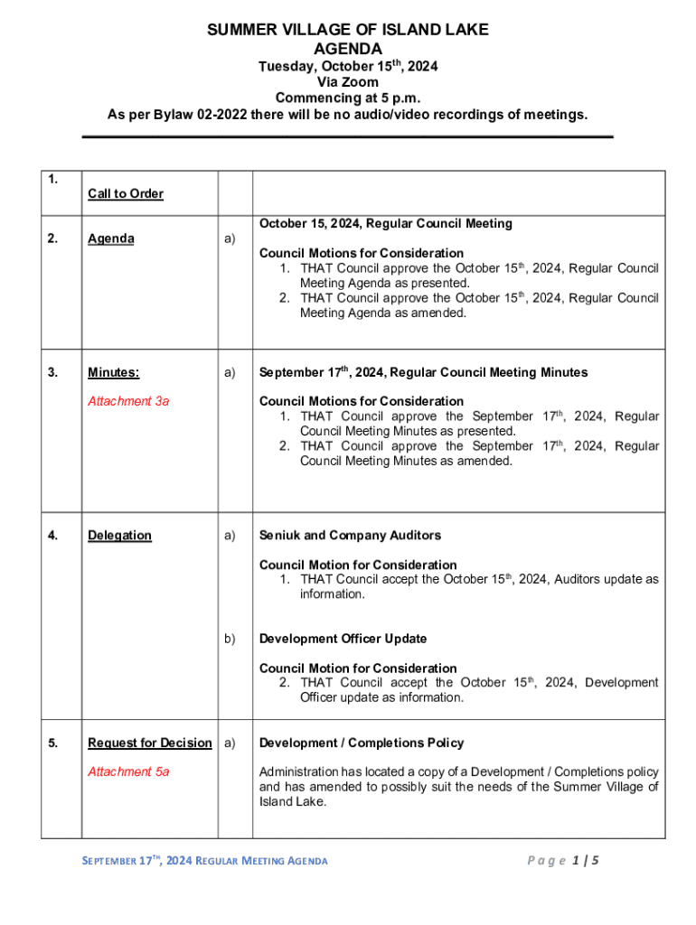 Document contains the agenda for the Regular Council Meeting of the Summer Village of Island Lake scheduled for October 15th, 2024, detailing items for discussion and decision.