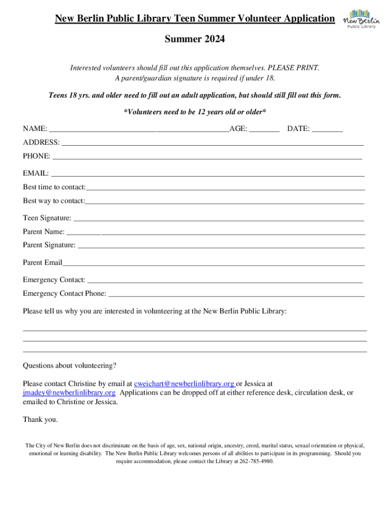 Get the free New Berlin Public Library Teen Summer Volunteer Application