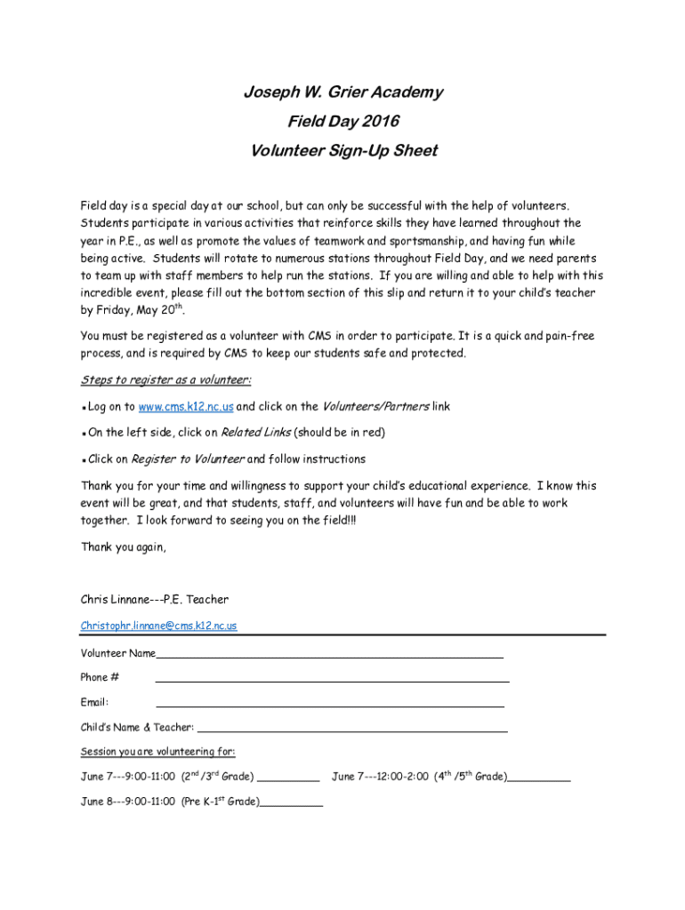 Get the free Joseph W. Grier Academy Field Day 2016 Volunteer Sign-up Sheet