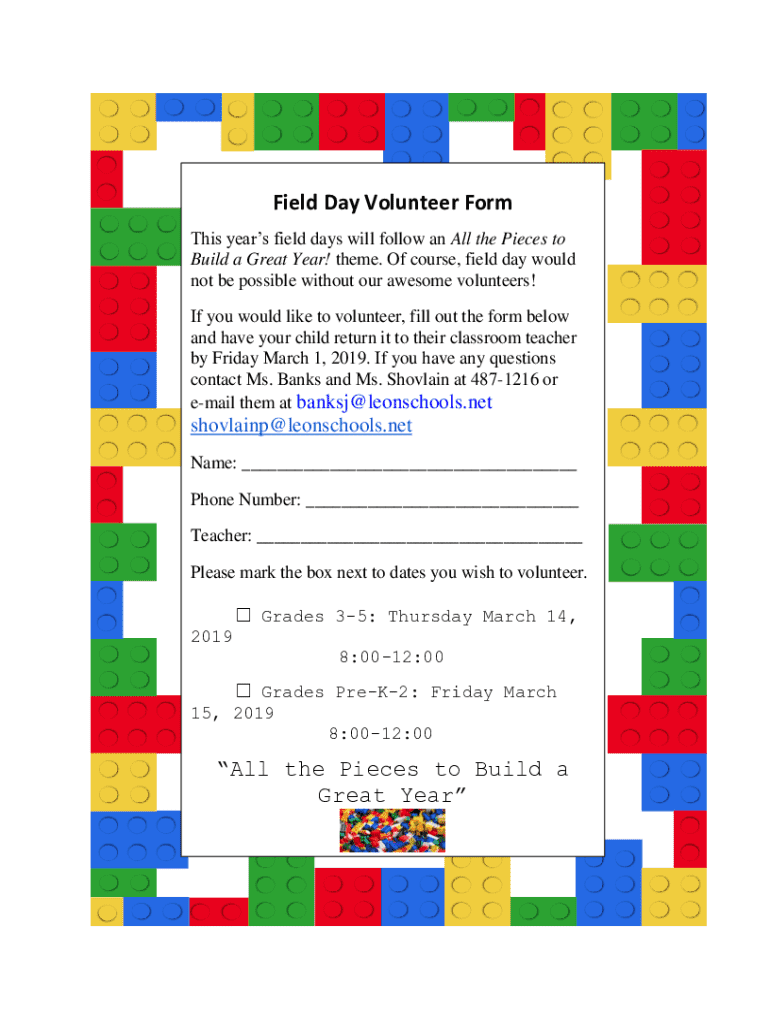 A field day volunteer form is a crucial document used to gather essential information from individuals who wish to participate as volunteers for a field day event. It serves as the primary channel through which organizers can coordinate volunteer efforts effectively, ensuring they have the right person for each task.