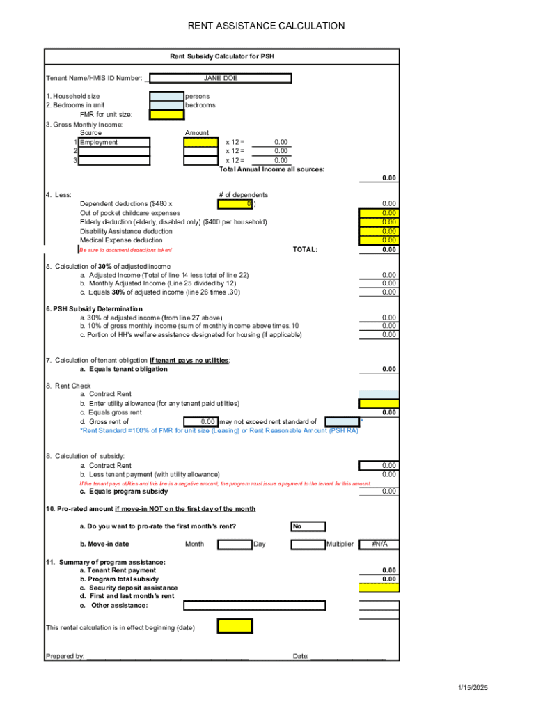 Rent assistance programs are designed to help individuals and families afford their housing costs when they face financial hardships. These programs typically offer monetary assistance or subsidies to lower the rental burden on qualifying households. The primary purpose of a rent assistance calculation form is to determine eligibility and the level of support provided based on income, household size, and other pertinent factors.