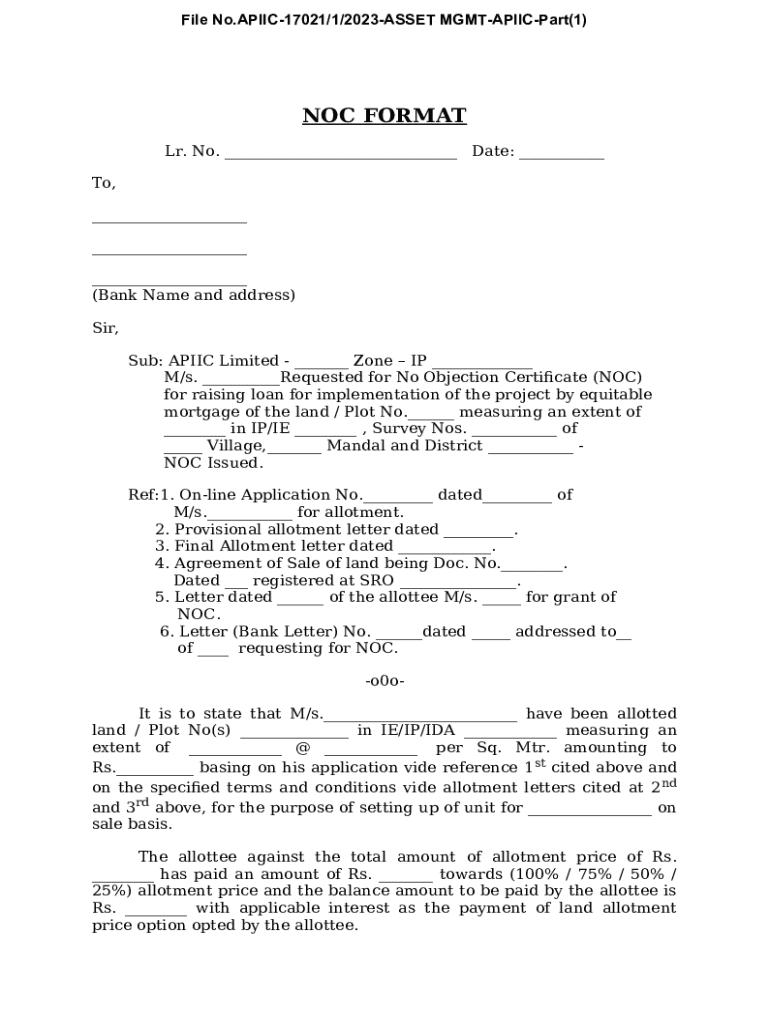 This document serves as a No Objection Certificate allowing the allottee to raise a loan by mortgaging the allotted land/plot for project implementation, subject to specified terms and conditions.