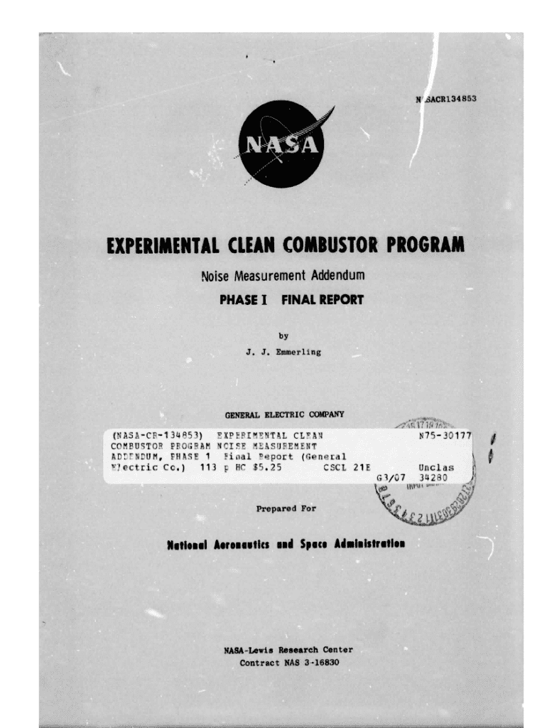 This final report presents the results of the noise measurements taken during Phase I of the Experimental Clean Combustor Program, detailing the acoustic characteristics assessed using waveguide probes