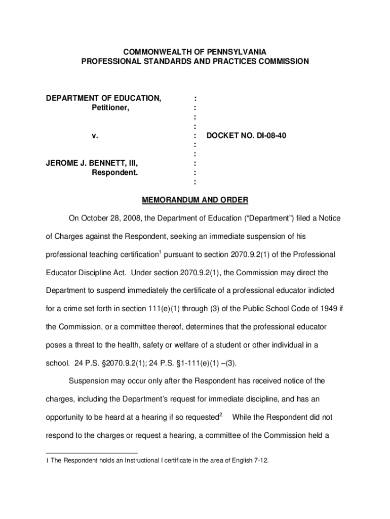 Get the free NO. DI-08-40 - Department of Eduation V. Jerome J. Bennett III. NO. DI-08-40 - Depar...