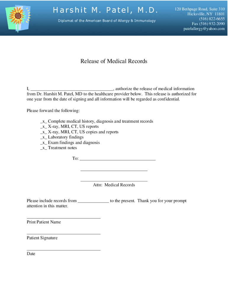 A document authorizing the release of a patient\'s medical records from Dr. Harshit M. Patel, MD to another healthcare provider for a period of one year.