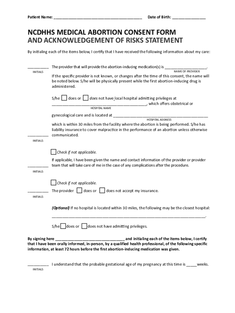 The NCDHHS medical abortion consent form comprises several crucial sections, each designed to capture essential information and ensure that patients understand and agree to the procedure. The initial part of the form includes patient information requirements, which mandate accurate personal and medical details.