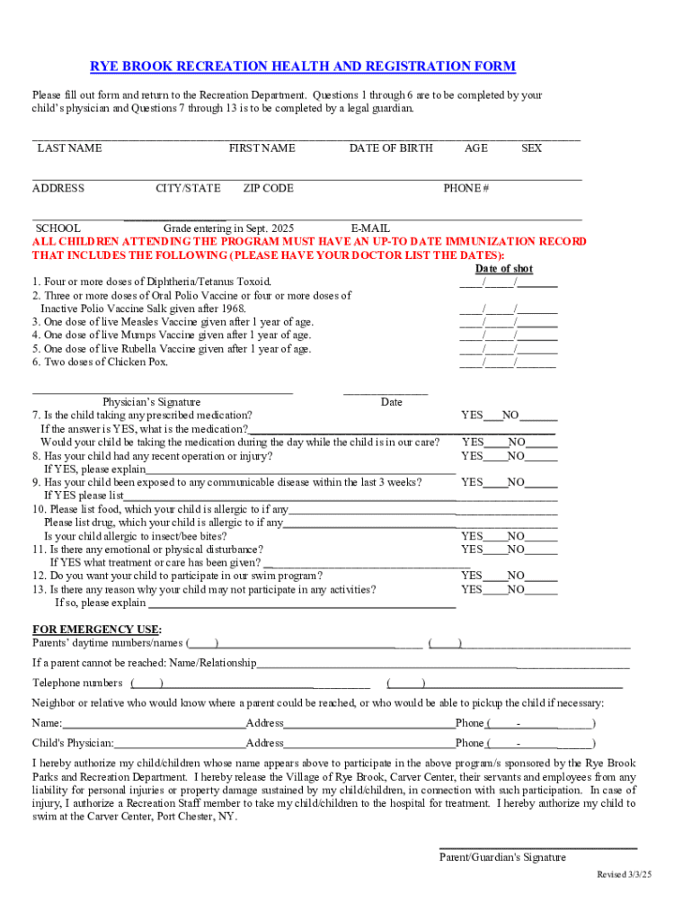 Completion of the Rye Brook Recreation Health Form is necessary for all participants intending to join recreational activities, including sports, camps, and other programs organized by the Rye Brook Recreation Department. Parents or guardians must complete the form for minors, while adults can fill out their own.