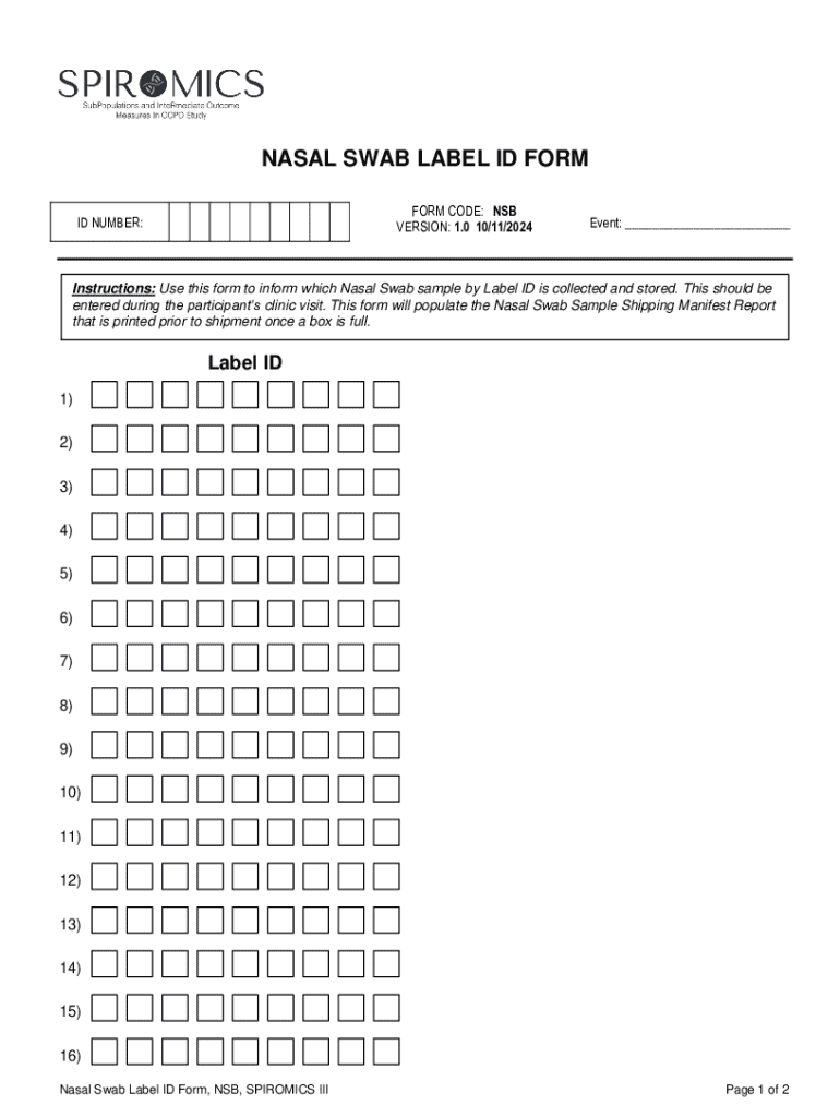 A nasal swab label ID form is a critical document used in healthcare for the collection and identification of nasal swab samples. This form ensures that samples taken for tests—such as COVID-19 or other respiratory pathogens—are accurately labeled, helping to facilitate effective diagnosis and treatment. As testing becomes increasingly crucial in public health, understanding the nuances of this form is essential for healthcare professionals, laboratories, and patients alike.
