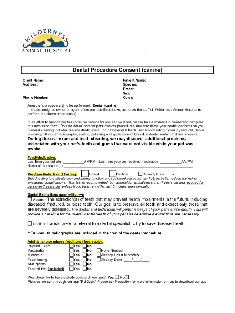Dental procedure consent forms are just the tip of the iceberg when it comes to the array of consent forms pet owners may encounter. Other relevant forms include those for vaccinations, surgical procedures, and treatments for chronic conditions. Each form serves a similar purpose: to ensure that owners fully understand the implications of various medical interventions their pets will face.
