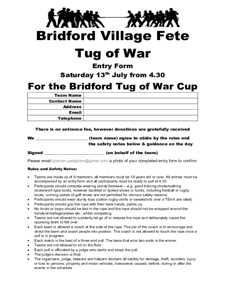 The Tug Form is a crucial document for teams wishing to participate in the Tug of War contest during the Bridford Village Fete. This form collects essential information about participants, ensuring that teams are organized effectively and adhere to the event’s rules. Completing the Tug Form accurately is of utmost importance as it streamlines event management, enhances safety, and maximizes the enjoyment of all participants.