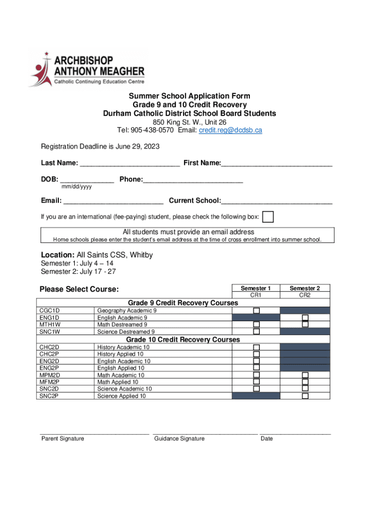 This document serves as an application form for students in grade 9 and 10 to recover credits during the summer school program offered by the Durham Catholic District School Board.