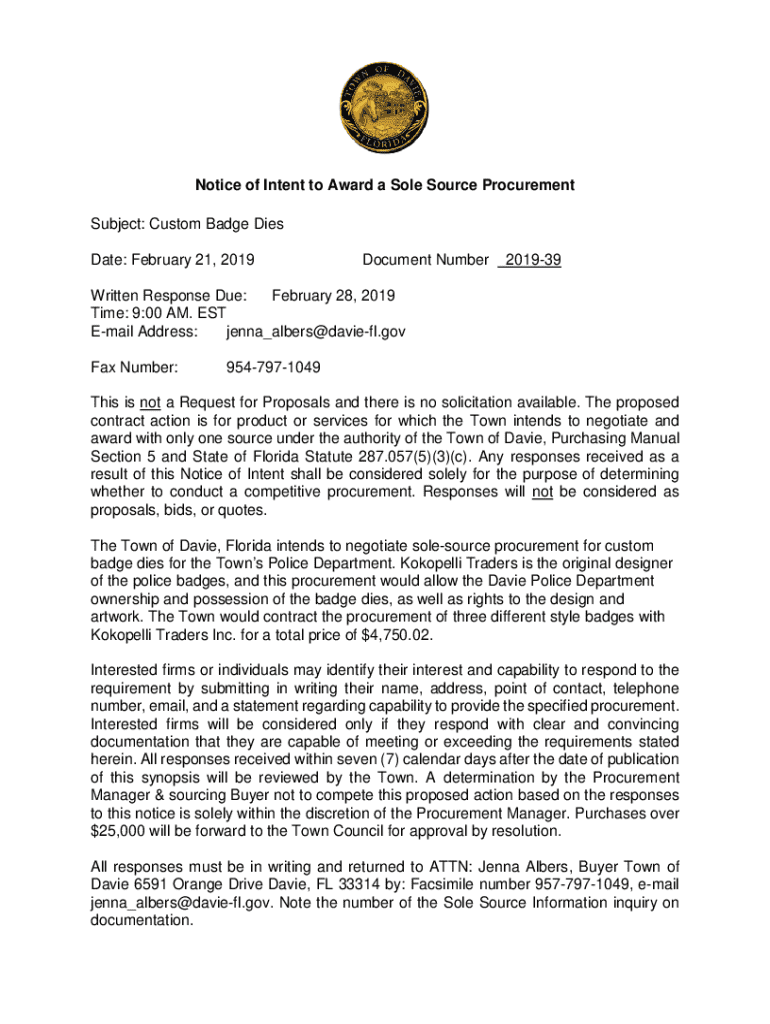 Get the free Notice of Intent to Award a Sole Source Procurement