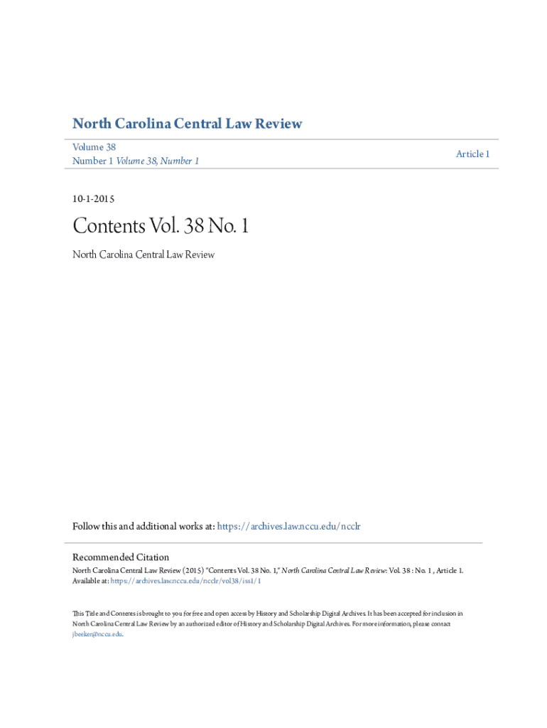 This document contains the table of contents for the first issue of Volume 38 of the North Carolina Central Law Review, including articles and editorial information.