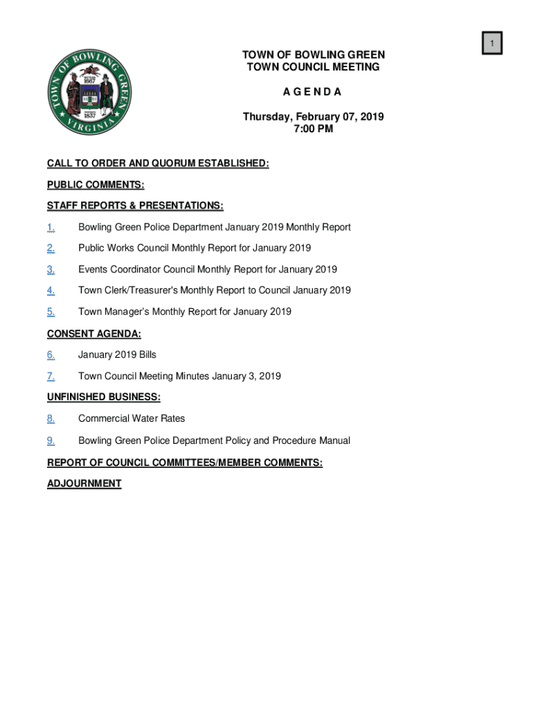 Get the free Town of Bowling Green Town Council Meeting Agenda