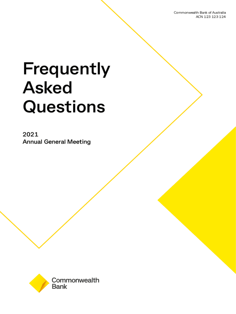 This document provides shareholders with frequently asked questions regarding the Commonwealth Bank of Australia\'s 2021 Annual General Meeting, detailing information about the virtual meeting, participation