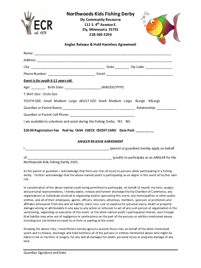 This document is an agreement for youth participants and their guardians to acknowledge risks and release liability while participating in the Northwoods Kids Fishing Derby.