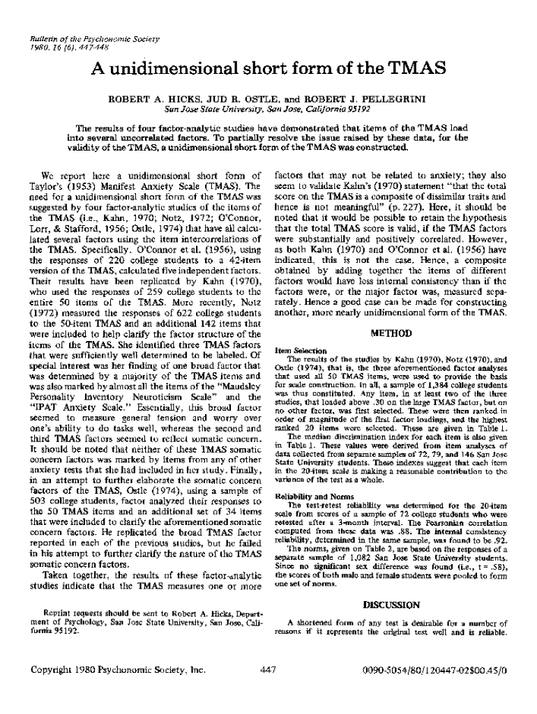 This document discusses the creation of a unidimensional short form of the Taylor Manifest Anxiety Scale (TMAS) based on several factoranalytic studies, addressing issues related to the validity and