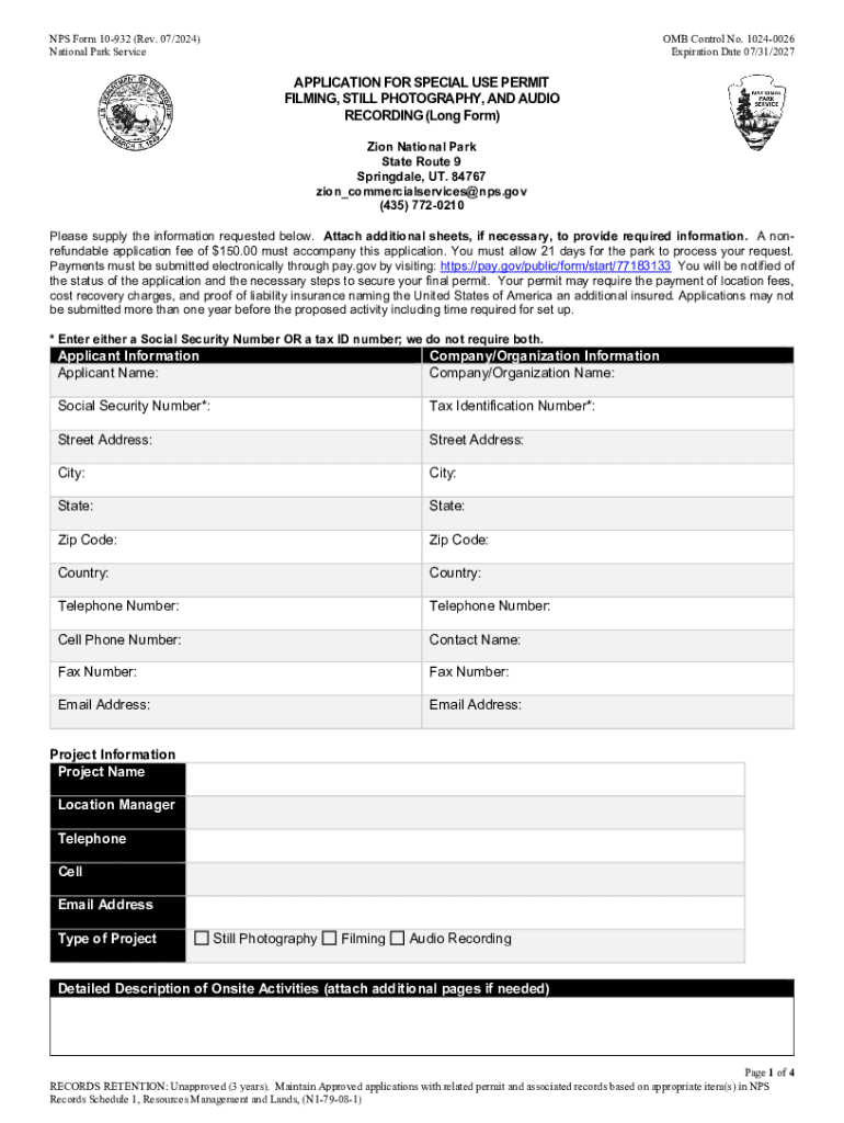 This document is an application form for obtaining a special use permit for filming, still photography, and audio recording activities at Zion National Park. It provides the necessary information