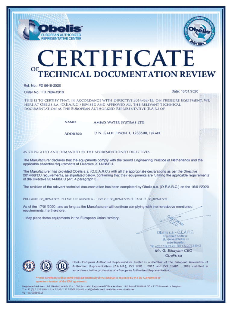This document certifies that Obelis s.a. has reviewed and approved the technical documentation for Amiad Water Systems Ltd in compliance with Directive 2014/68/EU on Pressure Equipment.