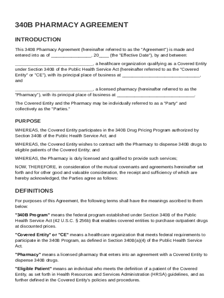 Every 340B Pharmacy Agreement contains critical sections that define the roles of participating parties. Understanding these components ensures clarity and compliance, minimizing disputes.
