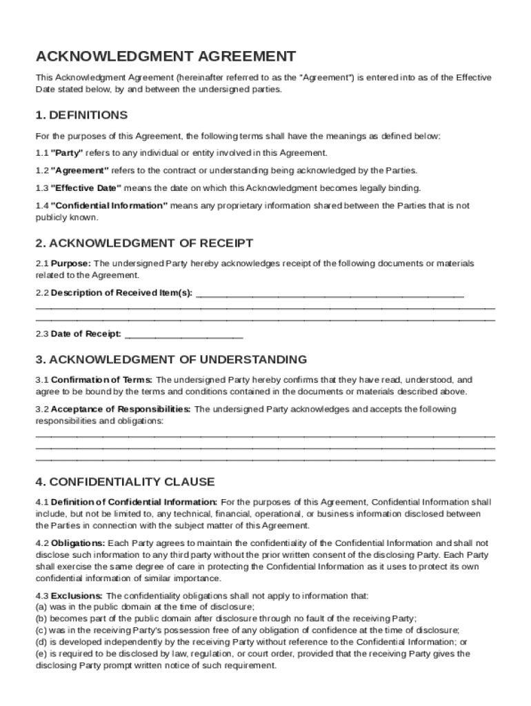 To fill out an Acknowledgment Agreement form, carefully read each section defining the involved parties, scope, and obligations. Enter relevant details such as Effective Date and Confidential Information clauses. Verify your entries for completeness and accuracy before signing.