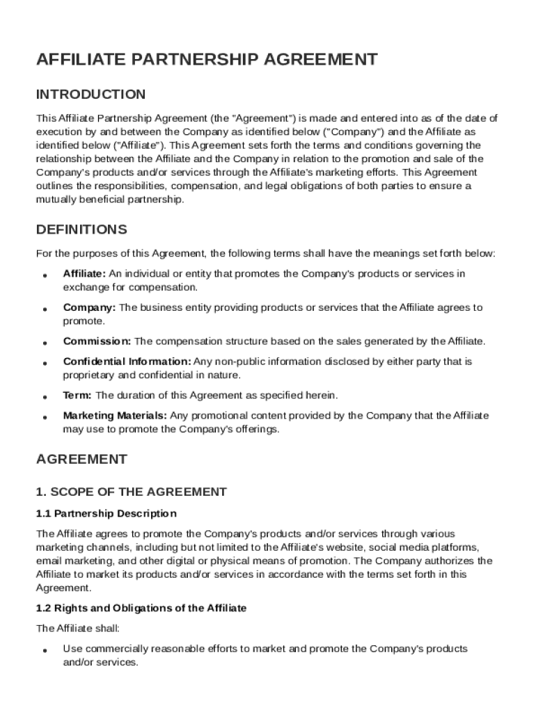 A sample template for an affiliate partnership agreement serves as a great starting point for customization. This should include placeholders for key details like the company name and affiliate name, ensuring users can tailor the document to fit their specific arrangement.