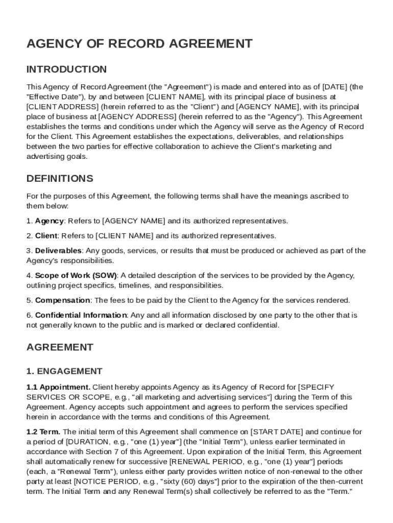 An Agency of Record Agreement formalizes the relationship between a client and an agency, providing legal protection and clarity for both parties.