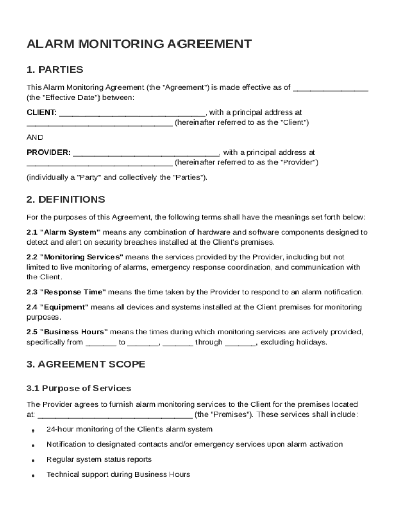 An Alarm Monitoring Agreement Template is a contract that outlines the terms and conditions under which an alarm monitoring service provider will monitor security systems for a client.