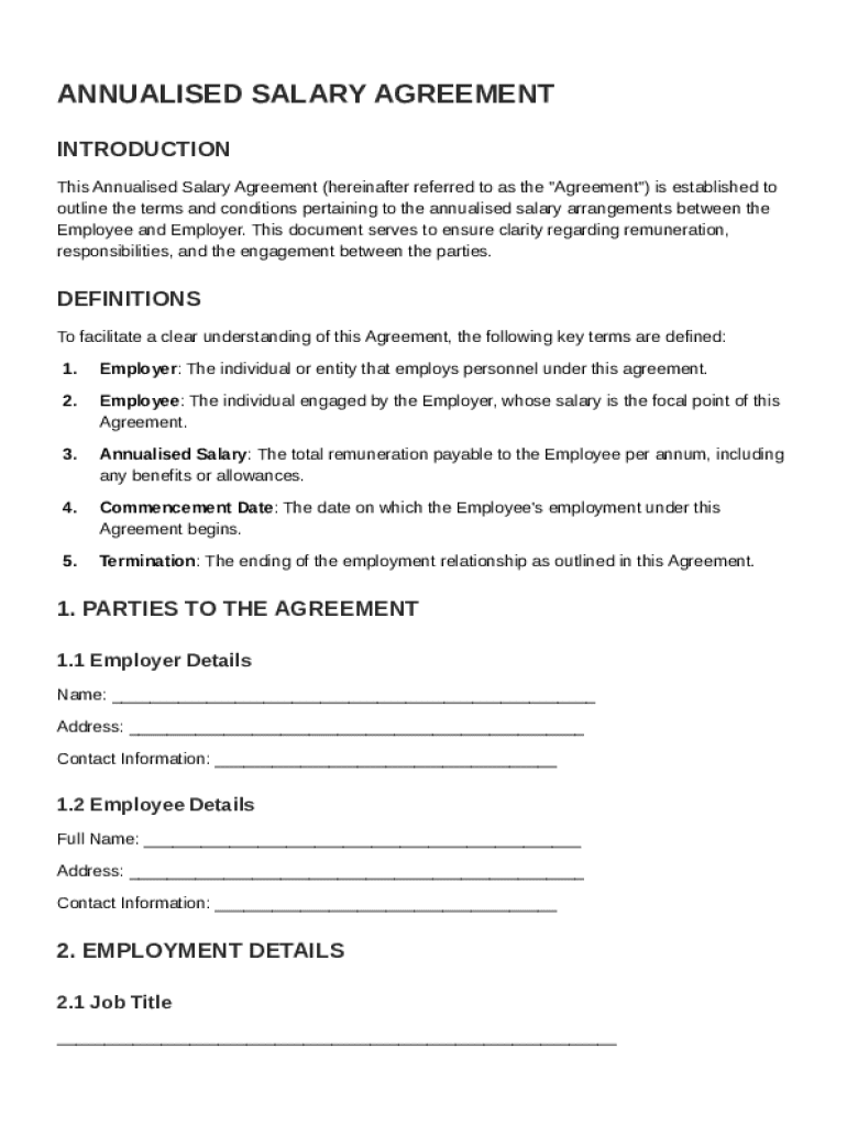 This document outlines the terms and conditions of the annualised salary arrangements between the Employee and Employer, ensuring clarity regarding remuneration, responsibilities, and engagement.
