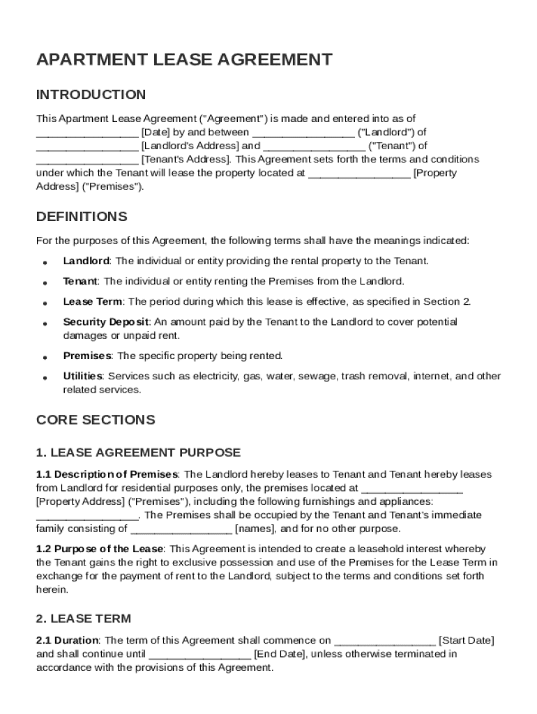 Core terms of an apartment lease agreement are foundational elements that outline the responsibilities of landlords and tenants. Without these definitions, the lease could create ambiguities that may lead to disputes.