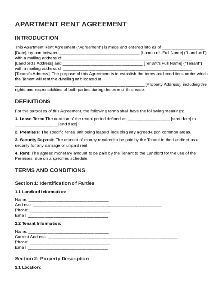 An Apartment Rent Agreement Template is a legal document outlining the terms and conditions for renting an apartment between a landlord and a tenant.
